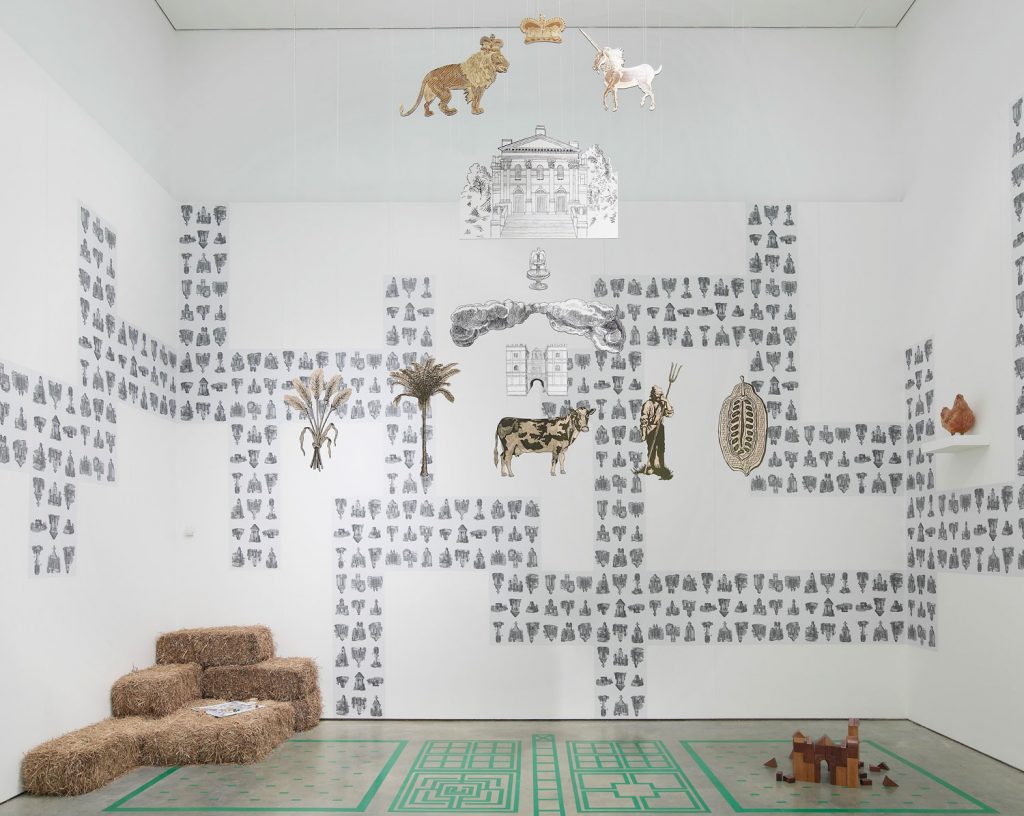 This exhibition by British artist Olivia Plender (b.1977) brings together sculpture, embroidery, posters, board games, architectural models and a video produced over the last ten years. Devised as a ‘museum of communication’, four room-sized installations are organised thematically, drawing on a broad range of references to explore how attitudes towards mass education have evolved over time. The Cube Gallery revolves around board games and printed material to encourage play and participation as a way of learning while the Middle Gallery looks to early twentieth century world fairs to examine the representation of the work ethic and trade. The Long Gallery re-creates a 1970s style TV studio which provides a platform for discussion around the use of television as a cultural and educational device and the Entrance Space imitates a Google-style working environment to demonstrate how distinctions between work and leisure, public and private have collapsed in recent times. With its strong architectural dimension, involving the construction of platforms and models and a deliberate emphasis on play and game-like structures, the exhibition invites visitors to participate and ‘perform’ while considering how social roles and models of society have been constructed over the last few hundred years.
